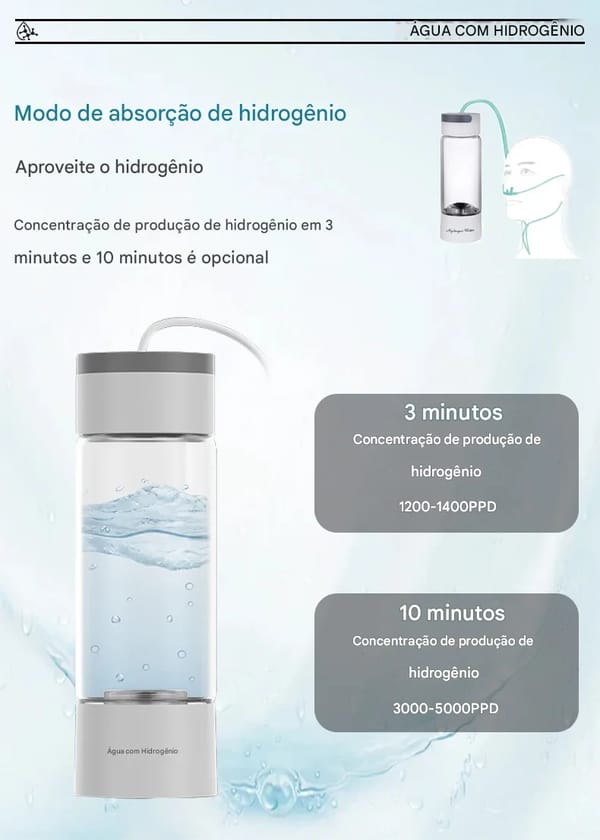 Produz água rica em hidrogênio em apenas 3 minutos, pronta para consumo imediato.