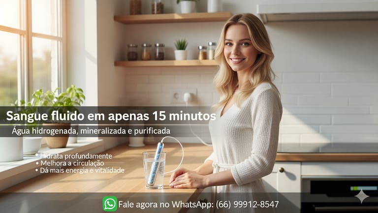 Por que isso importa? A presença de hidrogênio molecular e desses minerais pode melhorar a qualidade da água que você bebe, ajudando na hidratação celular, na circulação e na fluidez do sangue. Usuários e testes de microscopia antes/depois frequentemente observam mudanças visíveis no comportamento do sangue após consumir água tratada pelo bastão — por isso recomendamos documentar com exames se desejar comprovar os efeitos.