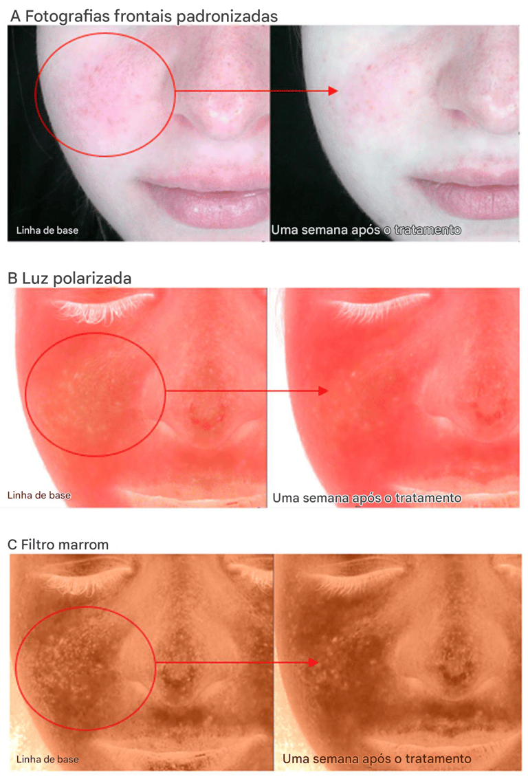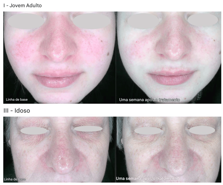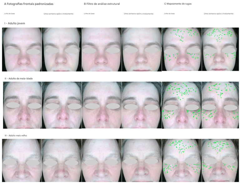 Figura 4.. Exemplos representativos de participantes de três faixas etárias são fornecidos, incluindo I para adultos jovens, II para adultos de meia-idade e III para adultos mais velhos. As imagens foram capturadas antes da primeira sessão de aplicação de hidrogênio (linha de base) e sete dias após a sessão final (uma semana após o tratamento). Os painéis ( A ) mostram condições sob luz visível padrão (condição geral da pele). Os painéis ( B ) mostram um filtro de análise de estrutura, onde áreas mais claras indicam maior irregularidade e áreas mais escuras refletem uma textura mais lisa e homogênea. Os painéis ( C ) mostram mapeamento de rugas, onde linhas mais profundas são visualizadas usando coloração verde cada vez mais intensa. Melhorias foram observadas em todas as três faixas etárias, particularmente com relação à regularidade da textura da pele e visibilidade das rugas. Os mapas estruturais mostram uma redução nas zonas de cor clara, indicando pele mais lisa após o tratamento. A densidade e a profundidade das rugas também parecem ter diminuído, especialmente nas regiões periorbital e da testa.
