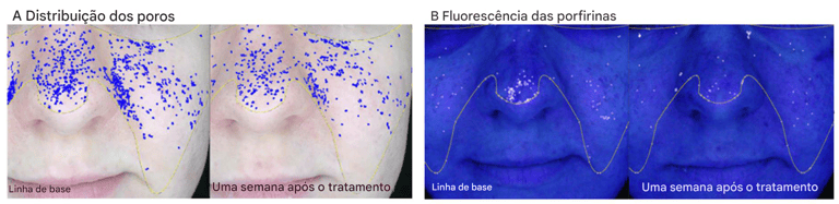 Figura 3. Exemplo representativo de um participante da faixa etária I (adultos jovens) apresentando características de congestão folicular e acúmulo de porfirina.